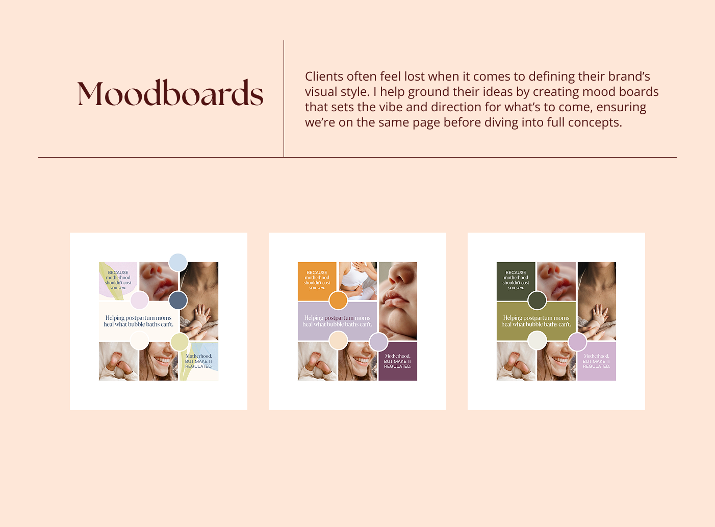 I dig deep into who your audience is and what emotions you want to evoke through your visuals. Together, we’ll use color theory, unique design elements, and a cohesive identity that sets you apart from the sea of cookie-cutter wellness brands.