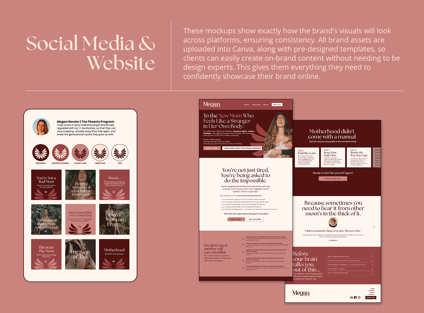 The Phoenix Program helps overwhelmed moms rebuild their energy, calm their nervous system, and rediscover who they are beyond motherhood. While most postpartum programs focus on surface-level self-care, Megan’s work goes deeper—combining therapy, nervous system regulation, and identity coaching to help mothers feel grounded, confident, and at home in their bodies again. For this project, I developed Megan’s complete brand identity, voice, messaging, and visual system, positioning her as the compassionate expert who meets women in the real, messy middle of motherhood. The result is a warm, grounded, and deeply human brand that gives exhausted mothers language for what they’ve been feeling—and shows health and wellness entrepreneurs how branding can turn empathy into impact.