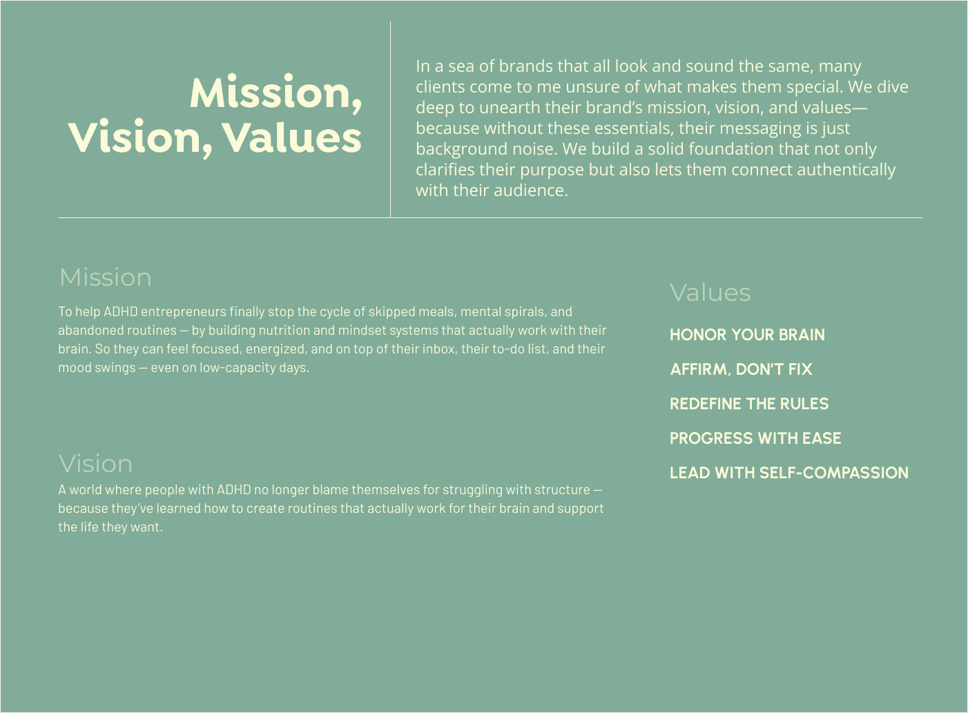 Alyssa helps ADHD entrepreneurs stop running on snacks, caffeine, and chaos—and finally build nutrition, mindset, and workflow systems that actually work for their brains. Unlike typical wellness programs or nutrition plans, Alyssa’s approach bridges evidence-based nutrition with ADHD-focused coaching, supporting energy, focus, and consistency even on low-capacity days. The result is a fun, spunky, and highly relatable brand that speaks directly to ADHD entrepreneurs, communicates expertise and empathy, and stands out in the crowded health and wellness space.
